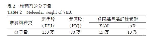 本工作采用多种增稠剂对砂浆的黏度进行调整,分别为天然植物多糖类增稠剂(定优胶和黄原胶)和合成纤维素醚类增稠剂(羟丙基甲基纤维素醚)两大类,各自的分子量列于表2中。