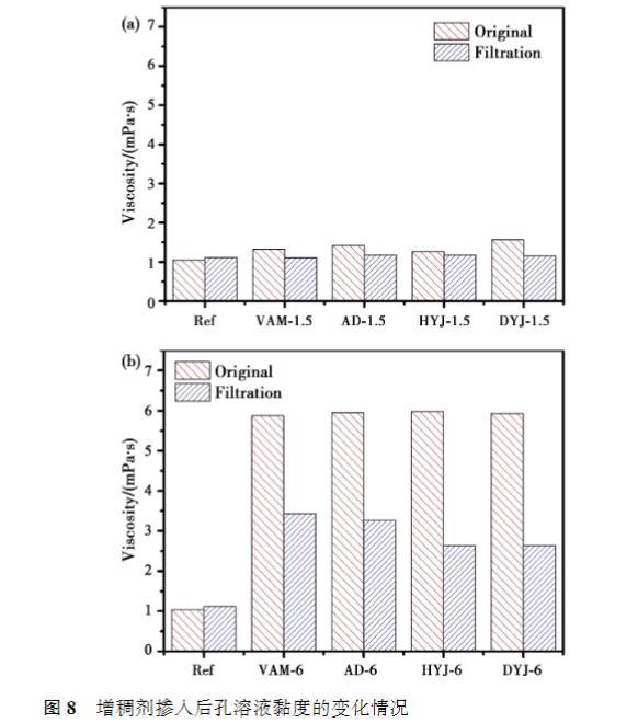 相同掺量下,DYJ的黏度最高,其次是HYJ,VAM和AD黏度在低掺量下接近,掺量达到0.10%之后,VAM黏度高于AD;VAM和AD的黏度随着掺量的提高缓慢增大,而HYJ和DYJ溶液的黏度随掺量的提高迅速提高,尤其是DYJ的增长幅度更为显著。总体来看,增稠剂分子量越大,相同掺量时溶液的黏度越高。从表面张力的结果来看,相同掺量下,HYJ溶液的表面张力最高,其次是DYJ,VAM和AD的表面张力显著低于其他两种增稠剂,且AD略微高于VAM.