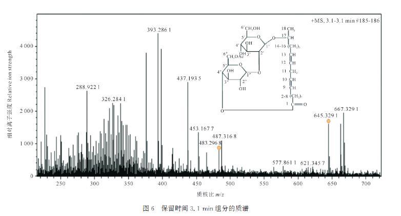 保留时间为3.1 min时色谱峰丰度最高。对该物质进行详细分析,质荷比(m/z)645.32的碎片为单乙酰基取代的内酯型槐糖脂的分子离子峰,m/z 667.32为[M+Na]+峰,m/z 483.29为[M+H-C8H12O6]+峰,其中C8H12O6为乙酰基取代糖环。上述分析表明此物质为内酯型槐糖脂,具体名称为:17-L-[(2'-O-β-D-吡喃葡萄糖基-β-D-吡喃葡萄糖基)-O-]十八二烯酸-1',4″-内酯-6″乙酸酯。