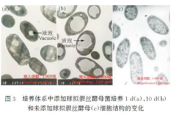 图3培养体系中添加球拟假丝酵母菌培养1d(a)、10d(b)和未添加球拟假丝酵母(c)细胞结构的变化