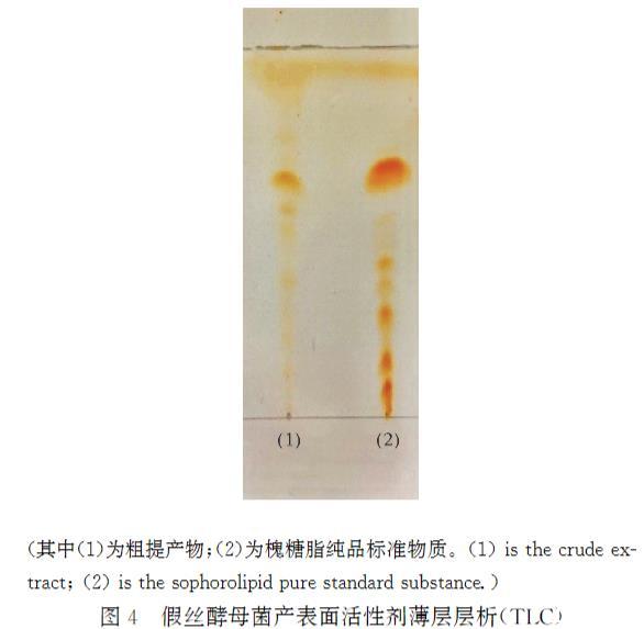 图4假丝酵母菌产表面活性剂薄层层析(TLC)其中(1)为粗提产物;(2)为槐糖脂纯品标准物质。
