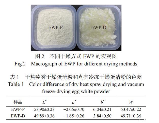 如图2所示,EWP-P为细腻的鹅黄色颗粒粉末,EWP-D为松散的黄色片状物。EWP-P的L*、a*和b*值分别为53.90±0.23、−2.06±0.70和6.04±0.21。EWP-D的L*、a*和b*值分别为49.89±0.36、−1.65±0.26和3.84±0.50(表1)。EWP-P的b*值较大是因为蛋清蛋白中的葡萄糖在喷雾干燥过程中与蛋白发生了美拉德反应。此外,真空冷冻干燥需将样品进行冷冻预处理,冷冻过程中,蛋清蛋白会发生褐变反应,故EWP-D最终呈现出的颜色较EWP-P黄(图2)。EWP-P的颜色较EWP-D白(图2),可能是因为干热喷雾干燥的干燥速度快,蛋清中的蛋白质受热时间短。因此在本实验干燥条件下,干热喷雾干燥所得的蛋清蛋白粉更亮、更白,易被消费者接受。