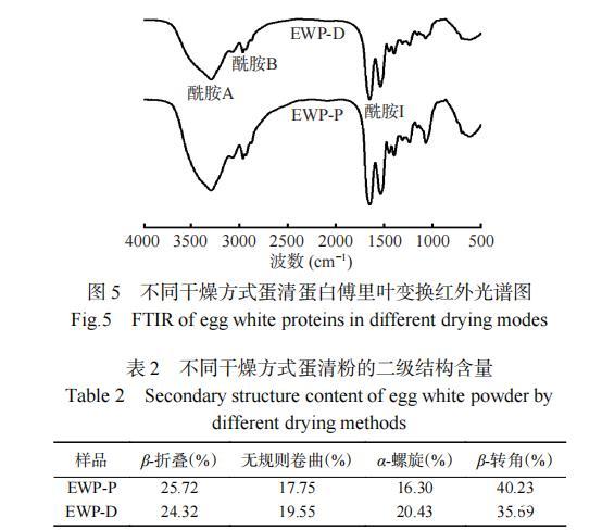 不同干燥方式蛋清蛋白的红外光谱如图5所示。EWP-P和EWP-D在酰胺A带(3700~3200 cm−1)处有强吸收峰,EWP-P的峰强大于EWP-D,表明干燥方式会影响蛋清蛋白的水合能力,这可能与蛋白质分子中N-H键舒展并与氢键形成了缔合体,或蛋白质分子与葡萄糖以共价键结合有关。酰胺B带(2961.64 cm−1)的弱吸收峰主要由C-N键产生。酰胺I带(1600~1700 cm−1)信号主要由C-O键伸缩振动引起,与蛋白质的二级结构有关,涉及β-折叠(1600~1640 cm−1)、无规则卷曲(1640~1650 cm−1)、α-螺旋(1650~1660 cm−1)和β-转角(1660~1700 cm−1)。采用Peak fit软件对不同干燥方式蛋清蛋白的酰胺I带峰强进行高斯曲线拟合分析,根据峰面积计算其二级结构的相对百分含量,结果如表2。EWP-P和EWP-D的二级结构以β-折叠和β-转角为主,EWP-P的β-折叠含量增加主要与卵转铁蛋白热变性有关,同时分子间的β-折叠结构也易转变为β-转角结构。而α-螺旋下降可能是因为热变性导致α-螺旋中的氢键断裂,进而发生了解螺旋现象。EWP-P无规则卷曲增加,表明其部分有序结构向无规则卷曲转化,蛋白变性明显,结构的随机性增强。