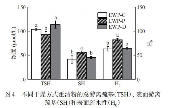 图4不同干燥方式蛋清粉的总游离巯基(TSH)、表面游离巯基(SH)和表面疏水性(H0)