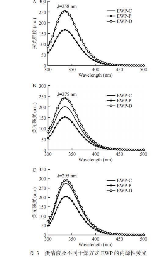 蛋白质的固有荧光来自于内部的芳香族氨基残基(酪氨酸Tyr、色氨酸Trp、苯丙氨酸Phe),其荧光最大值(λmax)、强度对其微环境的极性极其敏感,因此可用来表征蛋白质的三级结构变化,其中Trp、Tyr和Phe的特有荧光激发波长分别为295、275和258 nm。如图3所示,与EWP-C相比,不同干燥方式制备的蛋清粉的固有荧光强度降低但荧光峰的位置未有明显的迁移。EWP-P的荧光强度低于EWP-D于EWP-C,可能是因为喷雾干燥的干燥温度高,蛋清蛋白变性程度大,芳香族氨基酸残基暴露于更极性环境中,进而发生了荧光猝灭现象。此外,EWP-P的荧光强度较低还可能是由于蛋清蛋白中含有葡萄糖,在高温下会与蛋白质发生美拉德反应,屏蔽了芳香族氨基残基。