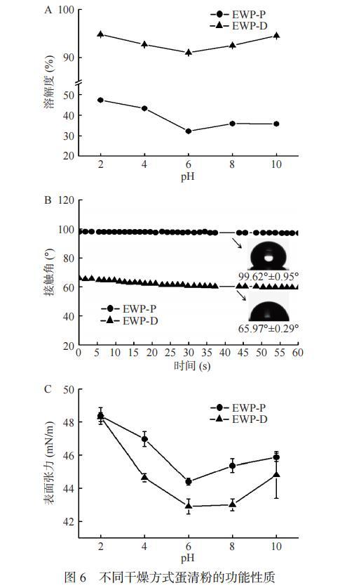 溶解性是蛋白重要的功能特性之一,与接触角、表面张力、乳化性等密切相关。如图6A,不同pH下不同干燥方式的蛋清粉溶解度的测量。EWP-P的溶解度随着pH的升高先减小后增大,这可能是因为在酸性和碱性环境中球状蛋白质会发生部分展开,形成熔融球状构象,变得更加灵活,更容易与水分子作用。pH为6.0时蛋清蛋白的溶解度最低,可能是因为该pH与蛋清蛋白中大部分蛋白的等电点相近,蛋白带电荷量较少,因此容易发生沉淀。与EWP-P相比,EWP-D在pH6.0时溶解度的下降程度较小,这可能与真空冷冻干燥后蛋清蛋白的微观结构呈片状,具有较大的比表面积有关,也可能是因为冷冻干燥蛋白质在脱水过程中蛋白质变性低,促进了可溶性聚集物生成。EWP-D的溶解度远大于EWP-P,这是因为喷雾干燥是直接将蛋清液雾化后再干燥,其蛋清粉表面会形成一个光滑、抗湿性的薄膜,最终导致蛋白的溶解性降低,复水性差且易结块。而真空冷冻干燥经过冷冻升华,可保持食品原有的形状故具有很好的速溶性和复水性。Shaviklo等也发现喷雾干燥的含添加剂(花粉)蛋白的蛋白质溶解度明显低于冻干蛋白。
