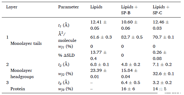 图5、从35 mN/m处的拟合获得的结构参数分别表示每层的厚度和水体积分数。ΔSLD(%)表示拟合SLD与理论SLD值之间的百分比差。