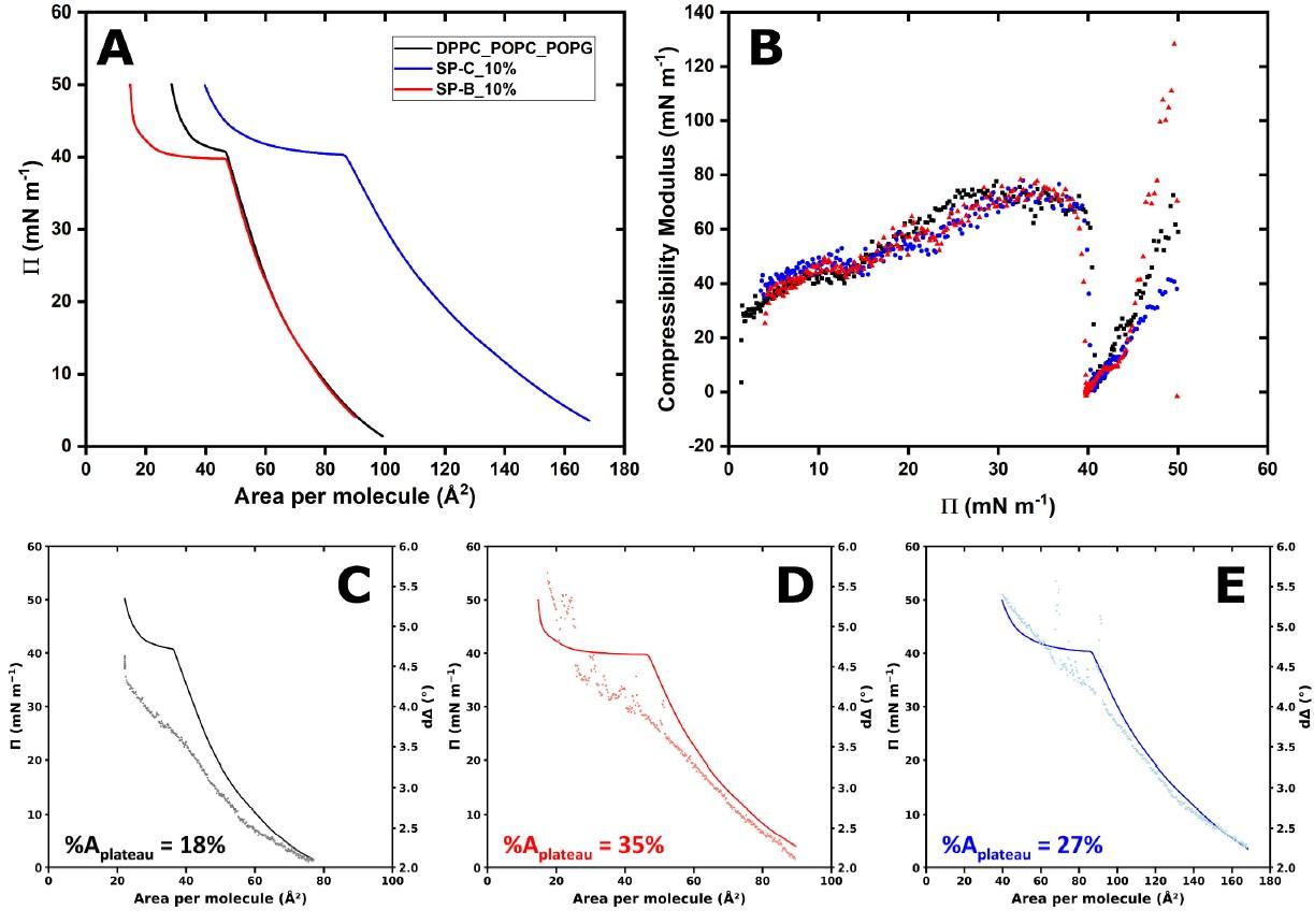 提出的结果清楚地证明了蛋白质SP-B在压缩下成核和稳定3D界面多层储层的关键作用,而SP-C的作用似乎是辅助的——促进脂质交换,但需要SP-B来结构整合到界面结构中。从表面循环前后的中子反射法的可比剖面推断出,这些SP-B促进的储层一旦受到类似呼吸的压缩-膨胀动力学,就会与界面稳定地结合。然后SP-B被证实是维持肺泡空间PS薄膜复杂结构的关键分子。本工作连接了早期的分子模拟和生理学研究,为SP-B独特的界面重塑能力提供了直接的实验证据,这与之前关于SP-B对呼吸和生命至关重要的知识一致。未来结合氘代蛋白、生理脂质混合物和全组合蛋白质补体的工作将完善对PS动力学的理解,对设计新一代优化的临床PS制剂以治疗尚未解决的表面活性剂缺乏性肺部疾病产生影响。