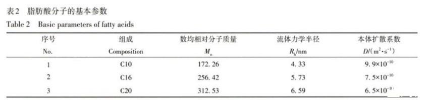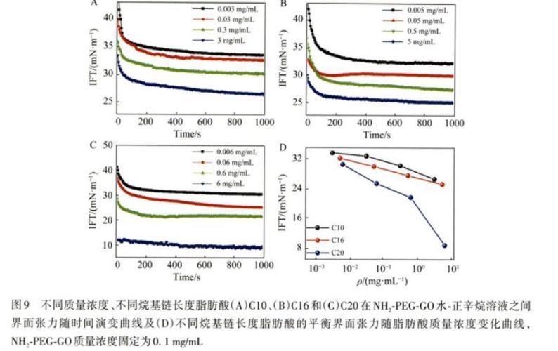 对比不同链长脂肪酸在不同质量浓度时的动态界面张力(图9A-9C),发现虽然脂肪酸在正辛烷中的扩散系数随着碳链的增长而减小(表2),但添加高质量浓度C20酸时,界面张力值到达平衡的时间明显缩短,这表明脂肪酸烷基链长度会影响脂肪酸在界面的性质。并且发现脂肪酸烷基链越长,与NH2-PEG-GO协同稳定的水-正辛烷界面张力越低。并且随着脂肪酸质量浓度增加,烷基链链长增加对界面张力降低效果越明显(图9D)。
