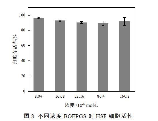 表面活性剂的毒理性质是评价表面活性剂安全性的重要参数,采用MTT法来测试BOFPGS对细胞活性的影响。将浓度梯度为8.04×10-6 1.6×10-4 mol/L(5~100 mg/L)的BOFPGS加入到96孔板中培养HSF细胞24 h,细胞活性变化情况如图8所示。从图8可以看出,HSF细胞在BOFPGS浓度为8.04×10-6 1.6×10-4 mol/L作用下其细胞活性都在90%以上。说明在8.04×10-6 1.6×10-4 mol/L浓度范围内,BOFPGS对HSF细胞没有表现出明显的毒性的,有望作为环保、安全的产品进行使用。