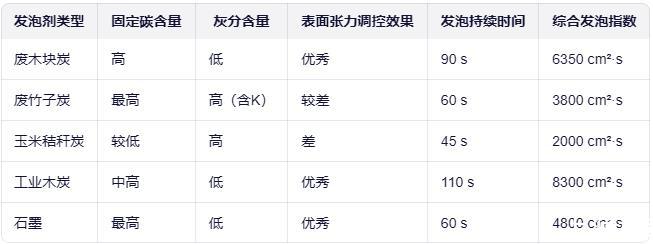 1.原料优化:筛选固定碳高(>75%)、灰分低(<5%)的生物质炭,如废木块炭,可有效降低表面张力,延长泡沫寿命。