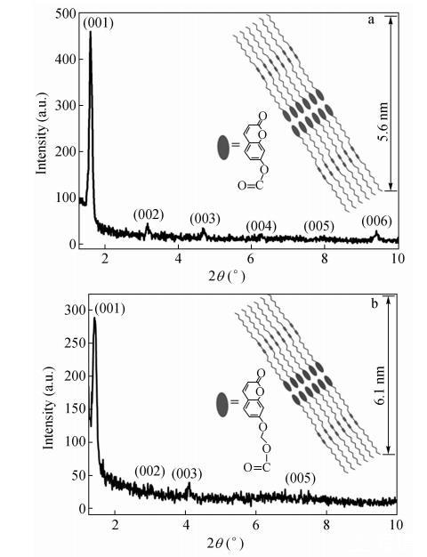 通过垂直沉积法在35mN/m的膜压下,将气-液界面上的单层膜转移到石英片上,制备CODA和CO2DA多层LB膜。81层CODA和CO2DA LB膜的小角X射线衍射图如图3所示。