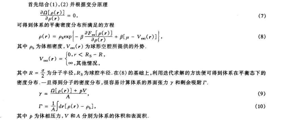 其中 R=σ/2 为分子半径,Rs 为球腔半径。在 (8) 的基础上,利用迭代求解的方法便可得到体系在平衡态下的密度分布。一旦得到分子 的密度分布,很容易计算体系的界面张力 γ 和剩余吸附 Γ。